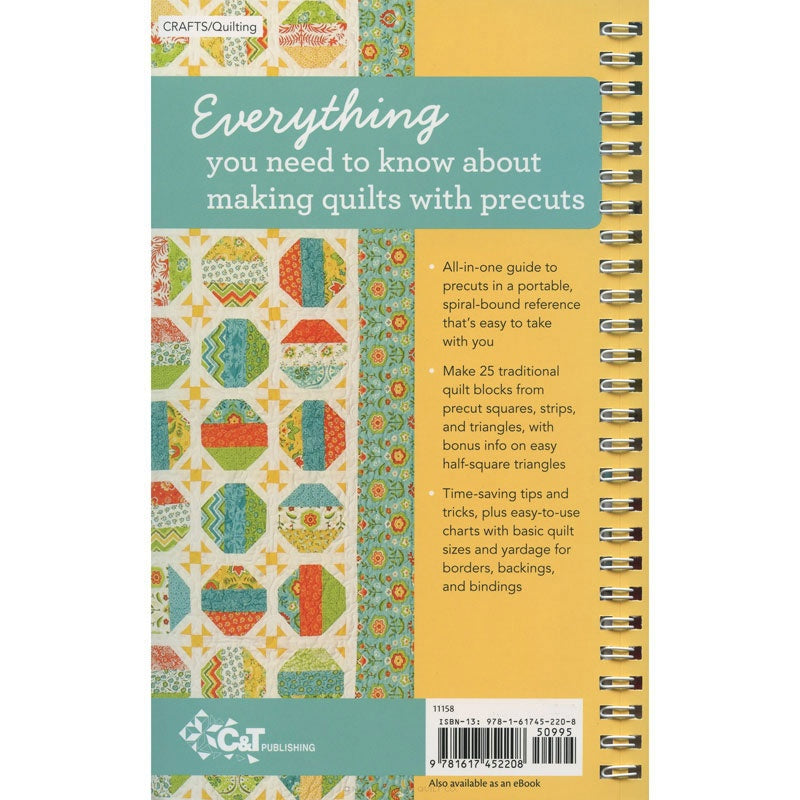 Everything you need to know about making quilts with precuts… Master precuts with this complete and indispensable guide to working with Charm Packs, Layer Cakes, Jelly Rolls, Turnovers, and more! Sew 25 traditional blocks from squares, half-square triangles, and precut strips with timesaving tips and tricks from the one and only Missouri Star Quilt Company. You’ll cover all the basics, including precut options, standard quilt sizes and needle types. Plus, finish your quilt like a pro with yardage and cutting info for borders, backings, and bindings! Easy-to-use charts, tables, and illustrations are at your fingertips in this handy, spiral-bound guide that’s easy to take with you.